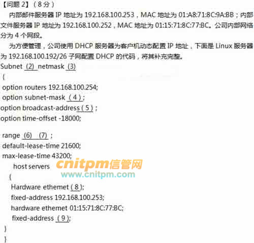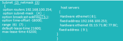 为方便管理,公司使用Dhcp服务器为客户机动态配置IP地址,下面是linux服务器为192.168。100.192/26子网配置dhcp的代码,将其补充完整。