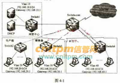 由于该企业路由设备数量较少,为提高路由效率,要求为该企业构建基于静态路由的多层安全交换网络.根据要求创建4个VLAN分别属于网营中心、生产部、销售部以及研发中心,各部门的VLAN号及lP地址规划如图4-1所示。该企业网采用三层交换机Switch-core为核心交换机.Switch-core与网管中心交换机Switchl和研发中心交换机Switch4采用三层连接.Switch-core与生产部交换机Switch2及销售部交换机Switch3采用二层互联.