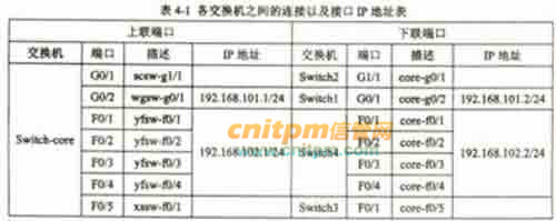 各交换机之间的连接以及接口IP地址如表4-1所示.