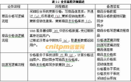 基于上述流程,系统设计人员进一步将业务流程细分为商品价格写逻辑流程、商品价格读逻辑流程和回源写逻辑流程三个部分。根据图5-1所示的业务流程和题干描述,从备选答案中选择正确的选项填写表5.2中的空(a)~(h),将解答写入答题纸的相应栏内。