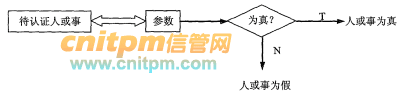 认证的基本思想是通过验证称谓者(人或事)的一个或多个参数的真实性和有效性,来达到验证称谓者是否名副其实的目的。这样,就要求验证的参数和被认证的对象之间存在严格的对应关系,理想情况下这种对应关系应是唯一的。其基本原理如下图所示。