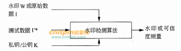 (2)水印恢复系统的输入是已经嵌入水印的数据,私钥或公钥,以及原始数据和(或)原始水印(取决于添加水印的方法),输出的是水印W,或者是某种可信度的值,它表明了所考察数据中存在给定水印的可能性,见下图。