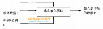 (1)水印嵌入系统的输入是水印,载体数据和一个可选的公钥或私钥,见下图水印可以是任何形式的数据,比如数值、文本、图像等等。秘钥可用来加强安全性,以避免未授权方恢复和修改水印。当水印与私钥或公钥结合时,嵌入水印的技术通常分别称为秘密水印技术和公开水印技术。水印系统的输出称为添加了水印的数据。