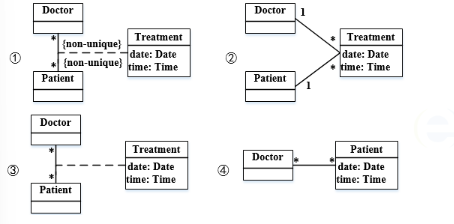 下图①②③④所示是 UML( )。现有场景:一名医生(Doctor)可以治疗多位病人(Patient),一位病人可以由多名医生治疗,一名医生可能多次治疗同一位病人。要记录哪名医生治疗哪位病人时,需要存储治疗(Treatment)的日期和时间。以下①②③④图中( )。是描述此场景的模型