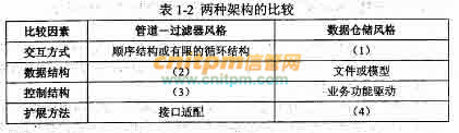 请在阅读题干需求描述的基础上,从交互方式、数据结构、控制结构和扩展方法4个方面对两种架构风格进行比较,填写表1-2中(1)~(4)处的空白。