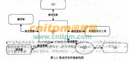 在确定采用数据仓库架构风格后,王工给出了集成开发环境的架构图。请填写图1-1中(1)~(4)处的空白,完成该集成开发环境的架构图。
