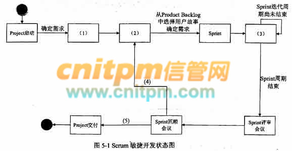 Scrum项目管理软件需真实模拟Scrum敏捷开发流程,请根据你的理解完成图5-1给出的Scrum敏捷开发状态图,填写其中(1)~(5)的内容。