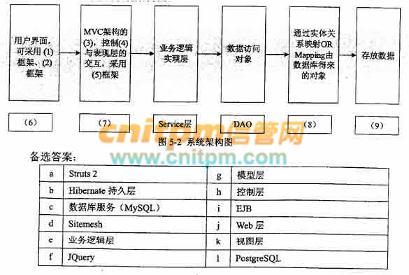 根据项目组给出的系统设计方案,将备选答案a~l的内容填写在图5-2中的空(1)~(9),完成系统架构图。