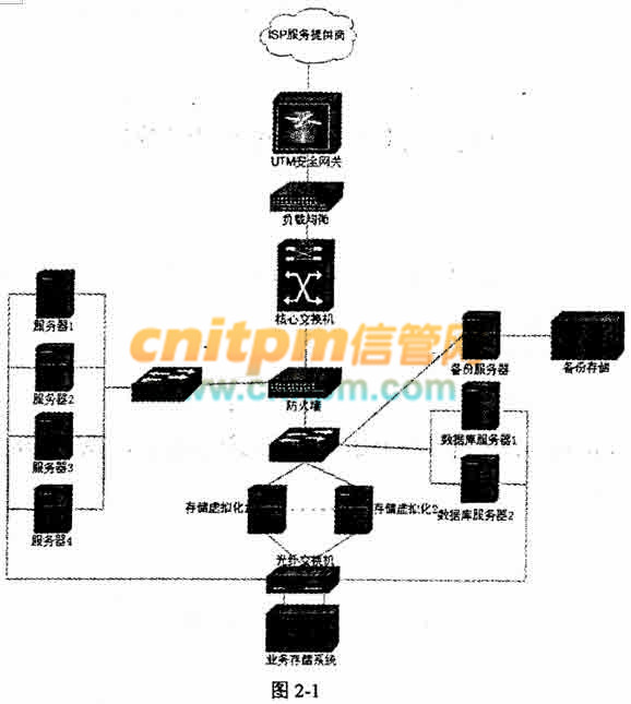 图2-1为某企业数据中心拓扑图,图中网络设备接口均为千兆带宽,:服务器1至服务器4均配置为4颗CPU、256GB内存、千兆网卡。实际使用中发现服务器使用率较低,为提高资产利用率,进行虚拟化改造,拟采用裸金属架构,将服务器1至服务器4整合为一个虚拟资源池。图中业务存储系统共计50TB,其中10TB用于虚拟化改造后的操作系统存储,20TB用于Oracle数据库存储,20TB分配给虚拟化存储用于业务数据存储。