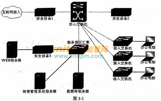 图3-1是某互联网服务企业网络拓扑,该企业主要对外提供网站消息发布、在线销售管理服务,Web网站和在线销售管理服务系统采用JavaEE开发,中间件使用Weblogic,采用访问控制、NAT地址转换、异常流量检测、非法访问阻断等网络安全措施。