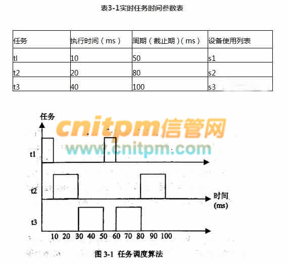 手持式野外辅助装备由三个实时任务和三个独立设备组成(分别表示为:t1、t2和t3;s1、s2和S3),表3-1给出了手持式设备实时任务的时间参数表,这些任务使用独立的设备并且所有设备的特征一致,各设备待机超时可直接进入睡眠状态,处于睡眠状态的设备要经过转换状态后才能进入运行状态。假设初始状态(t=0)设备处于工作状态,且所有设备的工作状态功率为60mw/ms,转换功率为30mw/ms,睡眠功率为10mv/ms。同时假设设备被唤醒的转换时间为10ms。设备待机后被关闭的超时值为10ms。