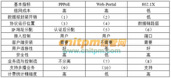 电信运营商的网络是种可管理网络,目前在用户管理方面用得比较多的王梳认证技术主要有PPPoE、基于web-Portal以及IEEE802.1x。这三种接入认证技术由于产生的时间,背景各不相同,因此应用的网络环境也不同,各有利弊。表2 l是这三种认证技术的部分性能比较,请补充完戚其中的空(1)~(10)。