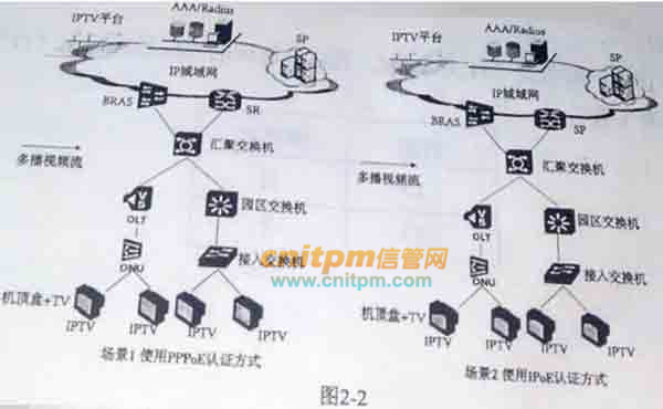 (1)请在图2-2中分别完威IPTV使用PPPoE和IPoE认证方式时多播视频流的流向和流数,并予以简单说明(其中,采用IPoE时多播复制点选择在园区交换机和OLT上)。