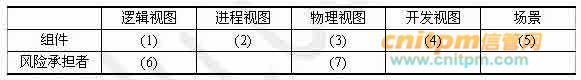 软件架构在软件需求与设计之间架起一座桥梁,也是风险承担者进行交流的手段,允许不同的风险承担者找出他们所关心的软件架构问题。假设采用面向对象的设计方法,各个视图涉及的组件(元素)包括:任务、类、模块、节点、步骤等,风险承担者包括最终用户、系统设计师、程序员、经理、项目管理师等。请在下表中的(1)到(7)处填入恰当的内容(空白处不用填)。