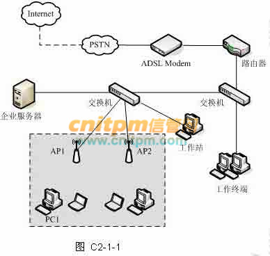某公司已有一个100用户的有线局域网。由于业务的发展,现有的网络不能满足需求,需要增加40个用户的网络连接,并在公司客户接待室连接网络以满足合作伙伴实时咨询的需求。现结合公司的实际情况组建无线局域网,具体拓扑如图C2-1-1所示。