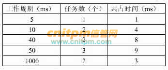 1)该宇航嵌入式系统由数据处理机、信号处理机以及数据采集模块组成。信号处理机主要通过数据采集模块将大量不同时间周期的外部数据采集进来,进行预处理(如FFT变换)后提交给数据处理机;数据处理机根据功能要求完成各种计算处理工作,并将结果输出。为了达到数据处理机和信号处理机的标准化,这两类处理机均采用同种处理机的体系结构(如:PowerPC7410)。整个系统工作的最大周期为ls,最小周期为5ms。数据处理机上任务分布如下表所示。