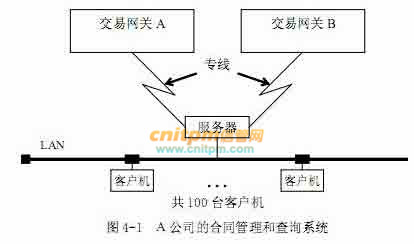 A公司准备建立一个合同管理和查询系统。该系统由1台服务器和100台客户机构成,服务器和客户机之间通过局域网进行通信,服务器通过专线联接到两个交易网关A和B。系统构成如图4—1所示。