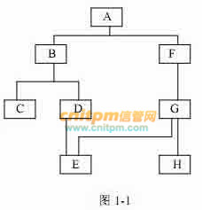 某程序 P 包括 A~H 八个模块,其结构如图 1-1 所示,其中模块 D 与 G 需要调用公共模块 E。