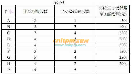 现计划采用自顶向下方法执行程序 P 的测试项目,该项目包括多个作业。设作业 A的任务是对模块 A 进行测试,作业 B 的任务是对模块 B 进行测试,...,依次类推。作业 P 的任务是对程序 P 进行整体测试。表 1-1 列出了该项目各作业计划所需的天数、至少必须的天数(即再增大花费也不能缩短的天数)以及每缩短 1 天测试所需增加的费用: