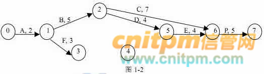 图 1-2 是尚未完成的该项目计划图,其中,每条箭线表示一个测试作业,箭线上标注的字母表示作业名,数字表示计划测试天数。