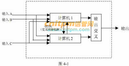 (2)为了提高整个系统的可靠性,控制系统采用容错处理,即用两个相对独立的计算机承担相同的工作,通过交叉对比,实现控制的双余度管理;当任何一台计算机出现故障时,系统可以进行单余度控制。系统结构如图 4-1 所示。