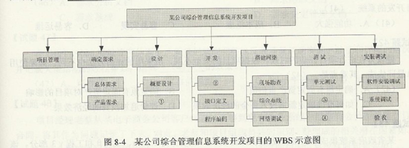 某公司综合管理信息系统开发项目的WBS分解结构图如图8-4所示。其中①、②、③、④空应该依次填入( ). A.架构设计、流程图设计、模块测试、功能测试 B.详细设计、模块定义、集成测试、系统测试 C.架构设计、模块定义、功能测试、系统测试 D.详细设计、功能定义、集成测试、验收测试