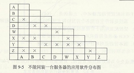 有8套计算机应用软件A, B, C. D, W, X, Y, Z要进行系统集成安装。虽然每套应用软件占用的存储空间不大,但部分应用软件调用操作系统底层相同的动态链接库(DLL),出于安全考虑,某些应用软件不能安装在同一台服务器上。在图9-5中,符号“x”表示相应的两套计算机应用软件不能安装在同一台服务器上。那么安装这8套计算机应用软件至少需要的服务器台数以及实现这种最少服务器台数的系统集成方案(不计各软件安装顺序)个数分别是( )