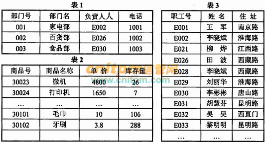 某公司的部门(部门号,部门名,负责人,电话)、商品(商品号,商品名称,单价,库存量)和职工(职工号, 姓名, 住址)三个实体之间的关系如表1、表2和表3所示。假设每个部门有一位负责人和一部电话,但有若干名员工;每种商品只能由一个部门负责销售。