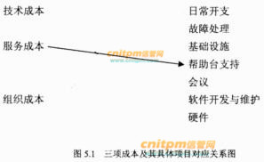 系统管理预算可以帮助IT部门在提供服务的同时加强成本/收益分析,提高IT投资效益。企业IT预算大致一可以分为三个方面:技术成本、服务成本和组织成本的预算,而且每项成本所包括的具体内容也不相同。图5.1的左边为三项成本,右边为三项成本的具体项目。请按图5.1中的示范,用箭线表示他们的对应关系。