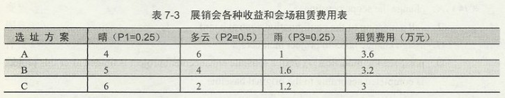 某系统集成公司为了扩大华北市场,希望在北京举行一个展销会,会址打算选择在北京市内的A,B,C 3个会场之一。获利情况与天气有关.通过天气预报了解到展销会当日天气为晴、多云、雨的概率,收益和会场租赁费用如表7-3所示,那么该公司所做的决策是( )。