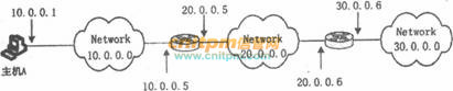 下图为一个互联网示意图。图中主机A的默认路由应该为( )。