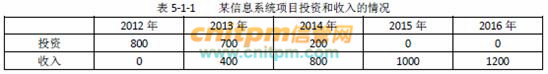 某信息系统项目,假设现在的时间点是2012年年初,预计投资和收入的情况如表5-1-1所示,单位为万元。假定不考虑资金的时间价值,那么投资回收期为(1) ,投资回报率为 (2)。 (1)A、4年 B、3年 C、3.5年 D、4.5年 (2)A、25% B、33.3% C、28.6% D、22.2%