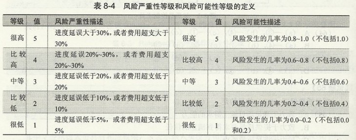 该公司对项目进度延误、费用超支的风险严重性等级和风险可能性等级的定义见表8-4.