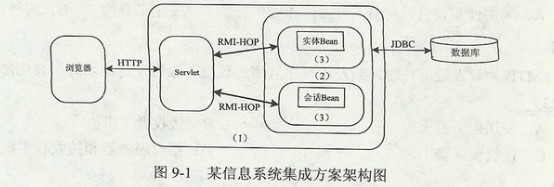 某规划架构师在J2EE平台上设计的一个信息系统集成方案架构图如图9-1所示,图中的(1)、(2)和(3)应依次填入( ).