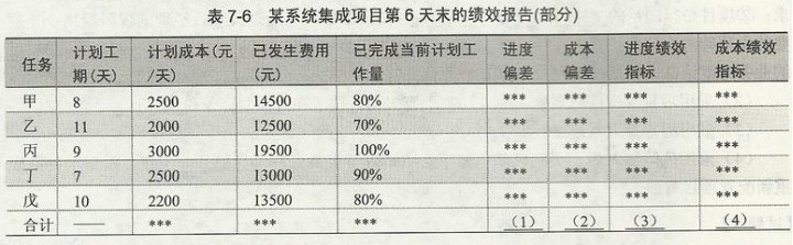 系统集成PB公司的项目经理小郭将其目前负责的某系统集成项目进行了工作分解,并对每个工作单元进行了成本估算,得到其计划成本。各任务同时开工,开工6天后项目经理对进展情况进行了考核,所形成的阶段性绩效报告如表7-6所示。表7-6中“***”表示此处的数据未给出。