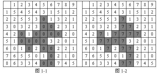 例如,一幅8*9像素的图像如图1-1所示。设用户指定点(3,5),其颜色值为0,此时其上方(2,5)、下方(4,5)、右方(3,6)邻接点的颜色值都为0,因此这些点属于点(3,5)所在的同色邻接区域,再从上、下、左、右四个方向进行扩展,可得出该同色邻接区域的其他点(见图1-1中的阴影部分)。将上述同色区域的颜色替换为颜色值7所得的新图像如图1-2所示。