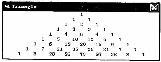 在下面的应用中,当窗口内发生Click事件时,窗口内将显示如图4-1所示的杨辉三角形(每一行都是三项式展开的系数)。请完善程序代码。