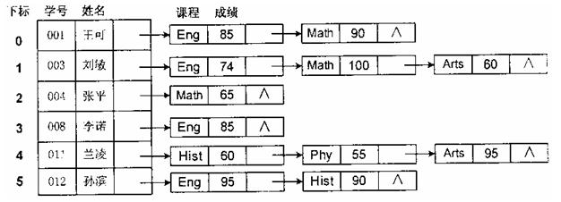 某班级有N名学生,他们可根据自己的情况选修名称和数量不尽相同的课程。设N等于6,学生信息、所选课程及成绩用链表结构存储,如图5-1所示。