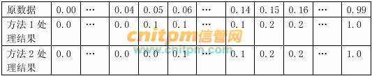 下表中,第一行依次列出了0.00,0.01,0.02,0.03,…,0.99,共100个数据;对第一行的每个数据采用方法 1 处理后形成第二行数据;对第一行的每个数据采用方法2处理后形成第三行数据。