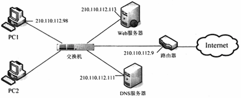 某网络结构如下图所示。在Windows操作系统中配置Web服务器应安装的软件是 (1) ,在配置网络属性时 PC1 的“默认网关”应该设置为 (2) 。首选 DNS 服务器应设置为 (3) 。
