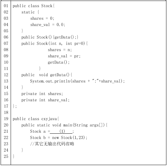 阅读以下说明和Java代码,请回答问题1和问题2,将解答写在答题纸的对应栏内。【说明】 已知类 Stock 和类 cxyjava 都定义在cxyjava.java文件中,类Stock的定义中第14行前共有四行出现了错误,将下面代码修改正确并完善后的输出结果为:0:0 1:23 【问题1】 请指出错误所在行号并给出该行修改后的完整结果。【问题2】 请补齐第21行代码中的空缺。【Java代码】