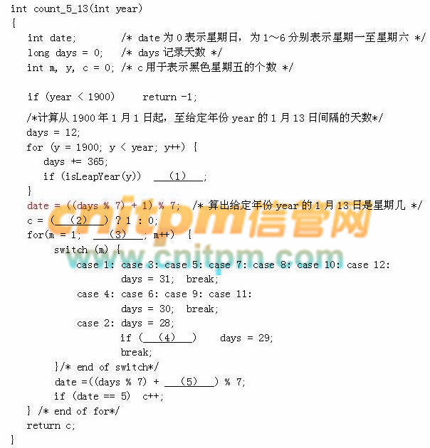 已知1900年1月1日是星期一,下面的函数count_5_13(int year)用于计算给定的年份year中有几个“黑色星期五”。“黑色星期五”指既是.13日又是星期五的日期。