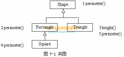 已知四个类之间的关系如图7-1所示,分别对每个类的方法进行编号,例如Shape的perimeter()为1号,表示为“1:perimeter()”,Rectangle类的perimeter()为2号,表示为“2:perimeter()”,依此类推,其中,每个类的perimeter方法签名相同。