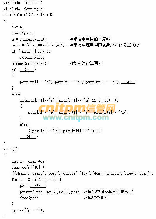 阅读以下说明和C程序,将应填入 (n) 处的字句写在答题纸的对应栏内。【说明】 下面的程序按照以下规则输出给定名词的复数形式:a. 若名词以“y”结尾,则删除y并添加“ies”;b. 若名词以“s”、“ch”或“sh”结尾,则添加“es”;c. 其他所有情况,直接添加“s”。【C程序】