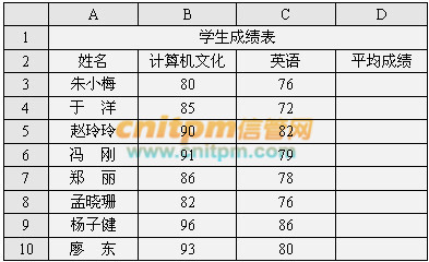 Excel学生成绩表如下表所示,若要计算表中每个学生计算机文化和英语课的平均成绩,那么,可通过在D3单元格中填写(1),并(2)拖动填充柄至D10单元格,则可自动算出这些学生的平均成绩。