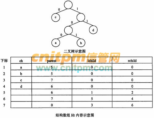 如果用“0”或“1”分别标识二叉树的左分支和右分支(如图 3-1 所示),从根结点开始到叶子结点为止,按所经过分支的次序将相应标识依次排列,可得到一个 0、1序列,称之为对应叶子结点的编码。例如,图3-1中a、b、c、d的编码分别是100、101、0、11。