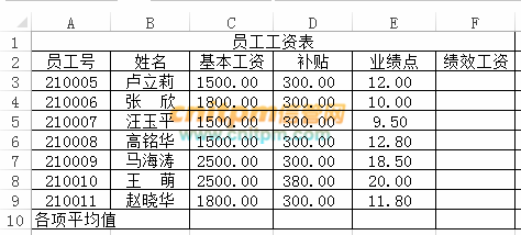 某单位的员工工资表如下图所示。当员工基本工资小于2000元时,绩效工资=基本工资X9%X业绩点;当员工基本工资大于等于2000元时,绩效工资=基本工资x8%x业绩点。若要计算绩效工资,可先在F3单元格中输入(1)并向垂直方向拖动填充柄至F9单元格,则可自动算出每个员工的绩效工资;若要计算各项平均值,则先在C10单元格中输入(2).拖动填充柄至F10单元格。