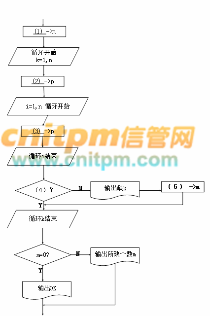 试题一(共15分)阅读以下说明和流程图,填补流程图中的空缺(1)~(5),将解答填入答题纸的对应栏内。 【说明】下图所示的流程图用于检查数组A[1:n]中的元素是否为自然数1~n的一个排序(含有1~n各数),若是,则输出OK,否则输出所缺的自然数及其个数m。为检查A[1:n]中是否含有k,只要判断P(k)=(A(1)-k)*(A(2)-k)*.....*(A(n)-k)是否等于0即可。【流程图】