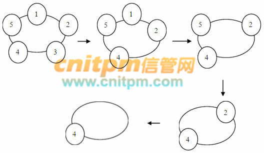 以n=5,m=3为例,其中圈顺序为3,1,5,2,4,过程如下图所示。