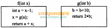 函数f()、g()的定义如下所示,已知调用f时传递给形参x的值是1。在函数f中,若以引用调用(call by reference)的方式调用g,则函数f的返回值为(1);若以值调用(call by value)的方式调用g,则函数f的返回值为(2)。(1)A.10 B.11 C.20 D.30 (2)A.10 B.11 C.20 D.30